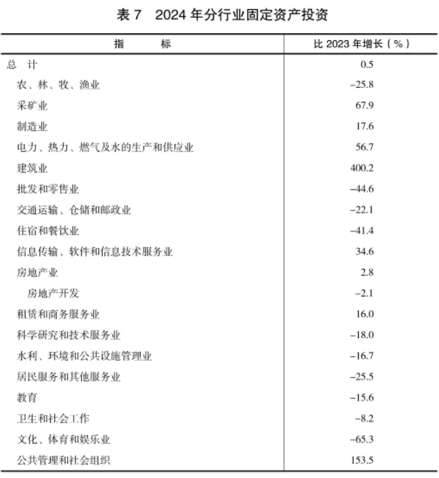 固定资产投资:全年固定资产投资比上年增长0.5%。