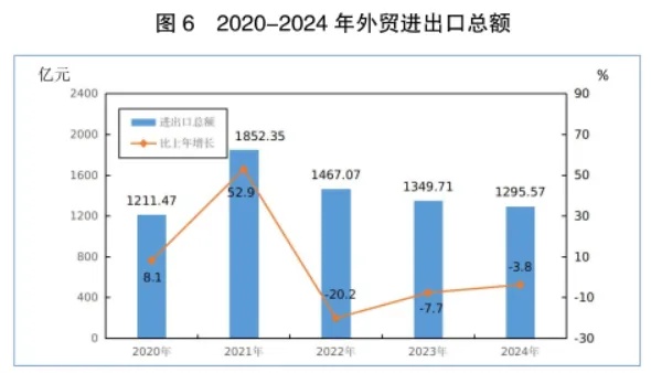 进出口贸易:全年外贸进出口总额1295.57亿元,比上年下降3.8%。其中:出口额832.89亿元,增长0.7%;进口额462.68亿元,下降11.0%。