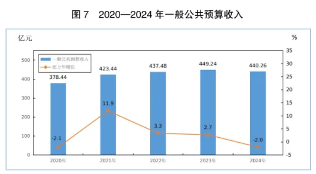 财政:一般公共预算收入440.26亿元,比上年下降2.0%,其中:税收收入308.94亿元,下降8.1%;非税收入131.32亿元,增长16.3%。