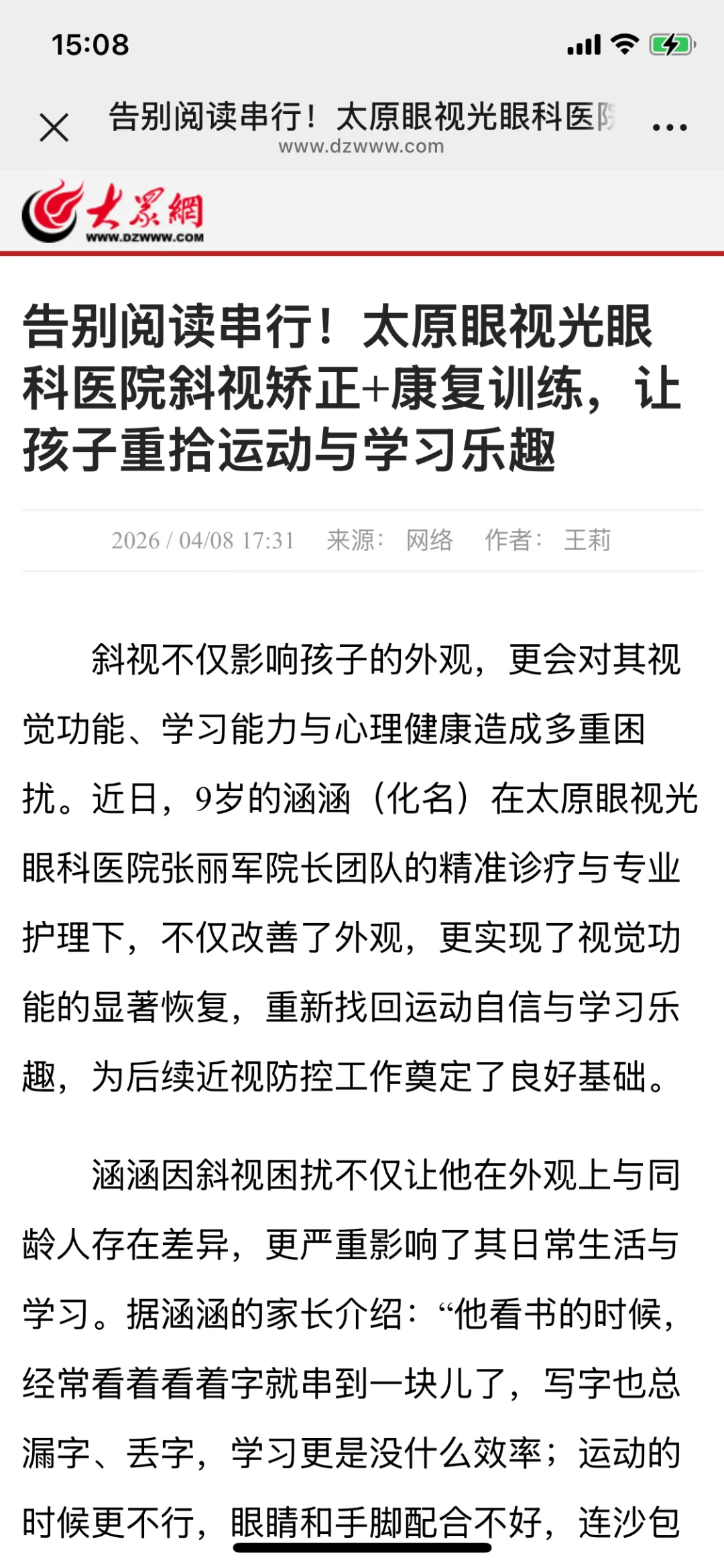斜视不仅影响孩子的外观,更会对其视觉功能、学习能力与心理健康造成多重困扰。近日,9岁的涵涵(化名)在太原眼视光眼科医院张丽军院长团队的精准诊疗与专业护理下,不仅改善了外观,更实现了视觉功能的显著恢复,重新找回运动自信与学习乐趣,为后续近视防控工作奠定了良好基础。