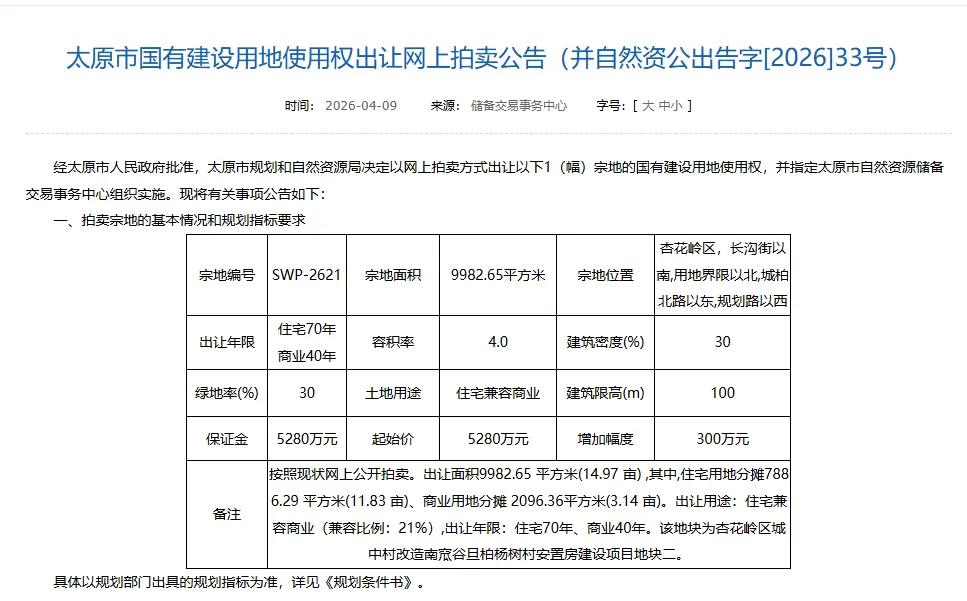 出让方式为按现状网上公开拍卖,起始价与保证金均为 5280 万元,增加幅度 300 万元,竞拍门槛清晰透明。值得一提的是,该地块为杏花岭区城中村改造南底谷且柏杨树村安置房建设项目地块二,肩负着区域安置与城市更新的重要使命。