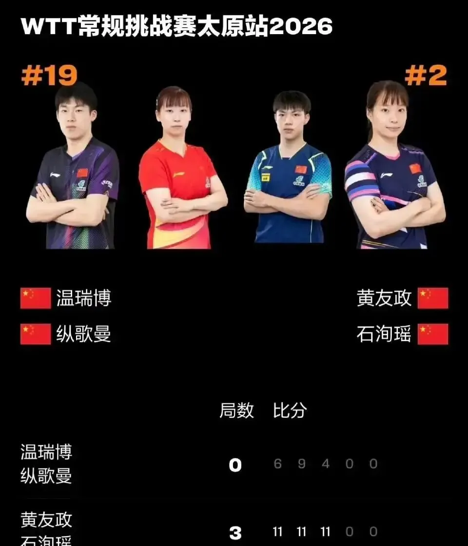 这场比赛属于WTT常规挑战赛,地点在太原,项目是混双1/8决赛,双方都是国乒新生代组合。获胜一方是黄友政/石洵瑶,两人此前已在多站国际赛事配对出战,混双积分在国内同龄梯队中名列前茅;落败的是温瑞博/纵歌曼,他们更多以单打、女双项目出现在球迷视野,混双配对时间不足一整年。