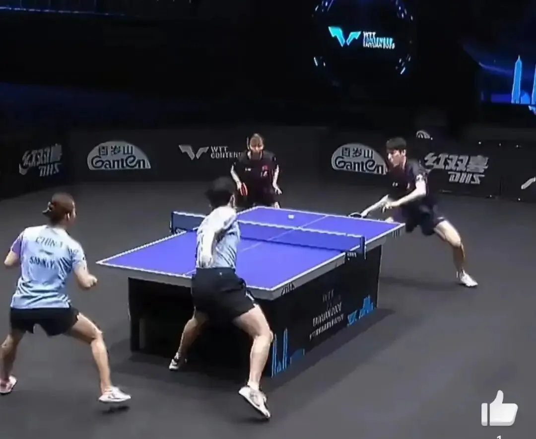 从技战术类型上看,两对组合的差异很清晰。黄友政是右手横拍,两面弧圈兼备,发球变化多;石洵瑶是左手持拍,正手相持质量高,这种“一左一右”的站位,让他们在反手对位时能自然形成交叉跑位。3局中至少有4个回合,在中台相持时,两人通过交叉换位,把对手压在同一侧,最终逼出高质量起板失误。
