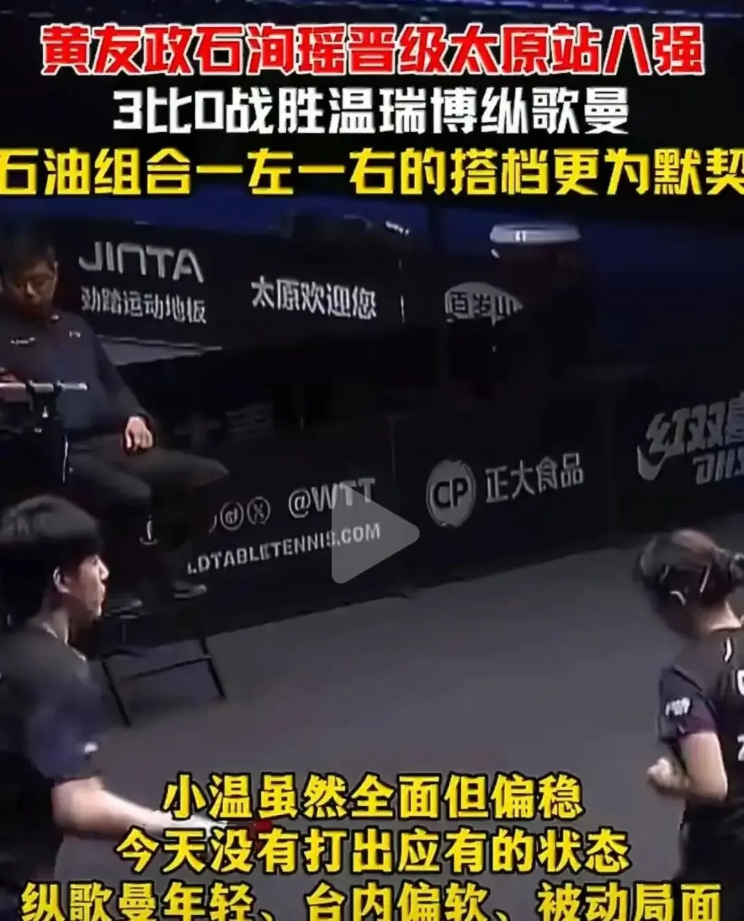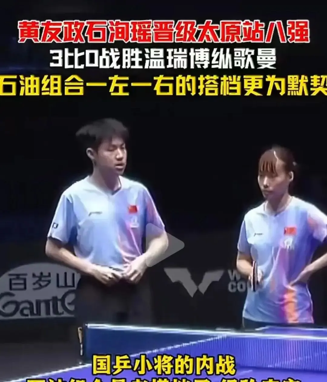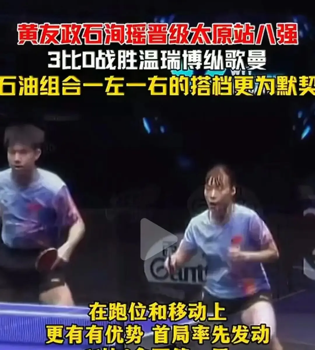 黄友政/石洵瑶在太原站混双1/8决赛中,以3比0干净利落通关,比分是11比6、11比9和11比4。