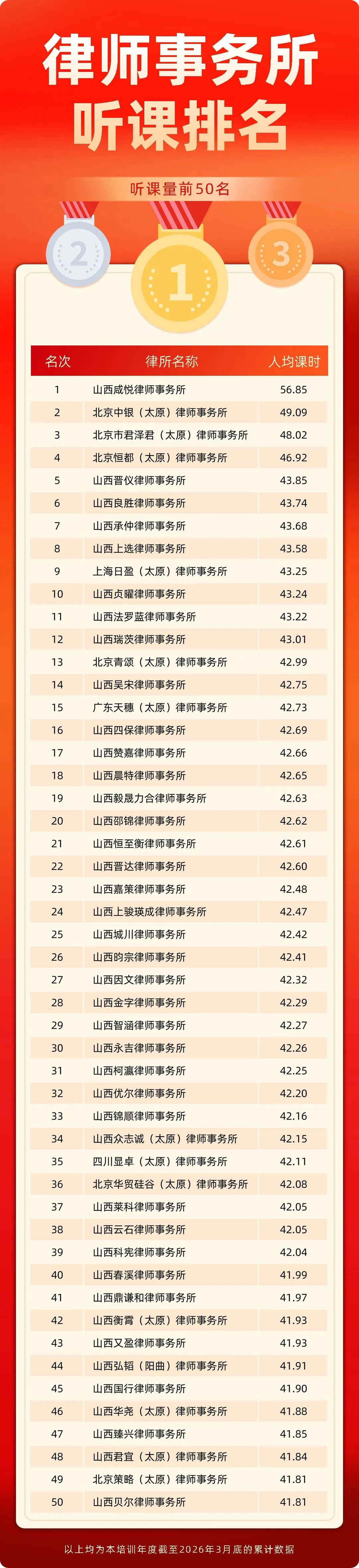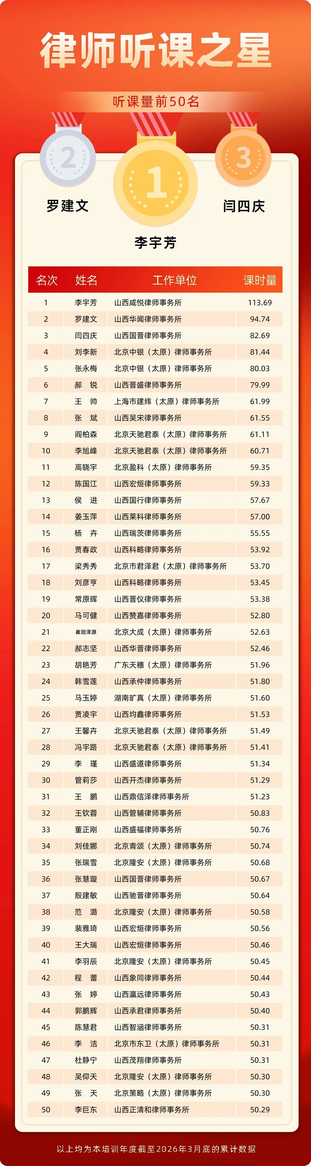 为了帮助律师不断提升政治素养、职业道德和专业技能,满足律师继续教育终身学习的需求。太原市律师协会委托点睛网提供在线“普惠培训”服务。现发布截至2026年3月底本学年律师听课排行榜。