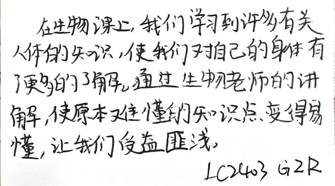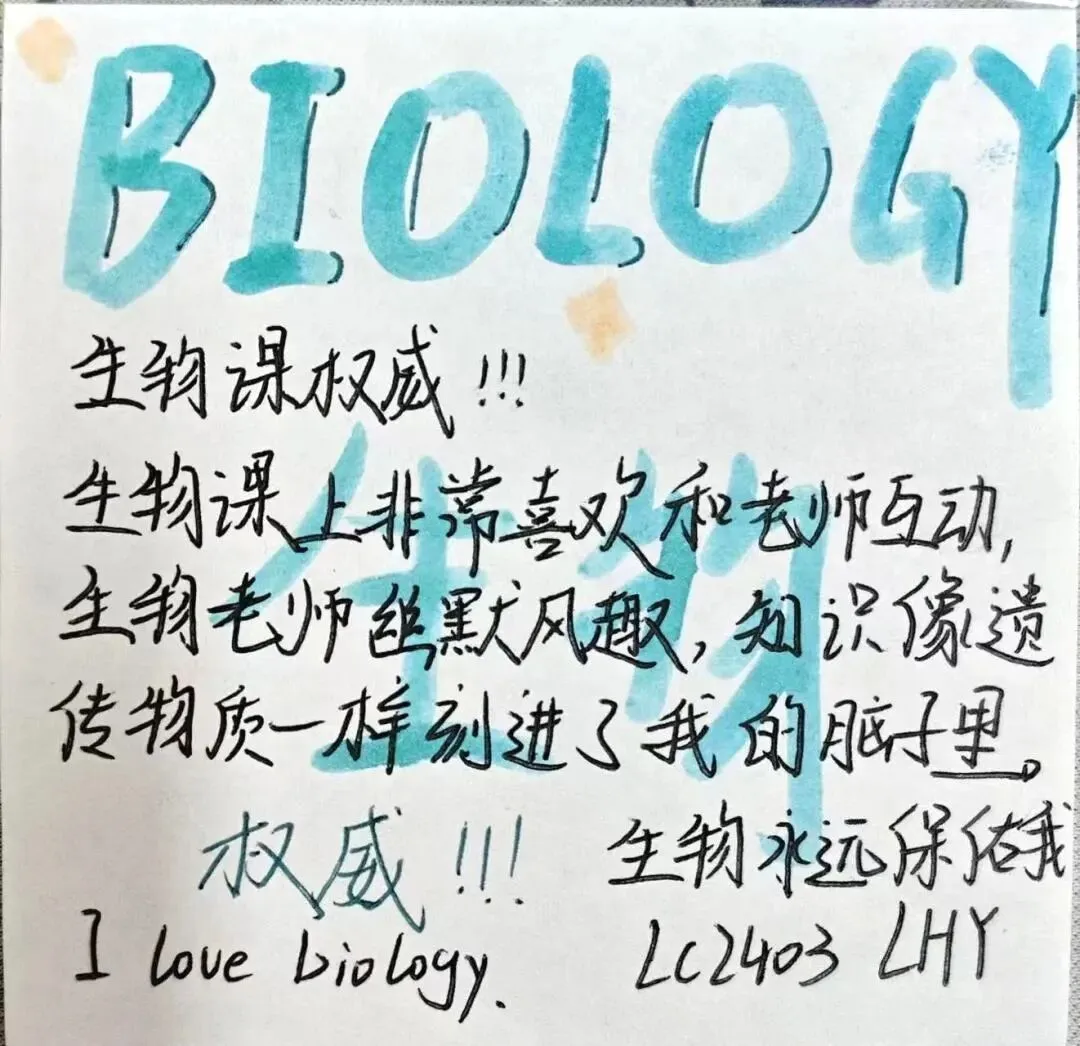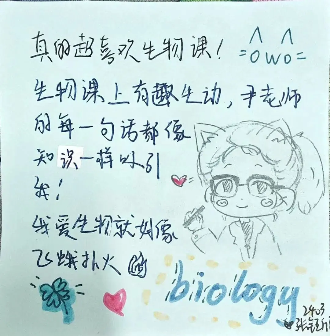 生物组的老师们以爱为桥,用心陪伴,用耐心解答困惑,用鼓励点燃热情。同学们用文字、图画表达对生物课和老师的喜爱,字里行间满是真诚与热忱。