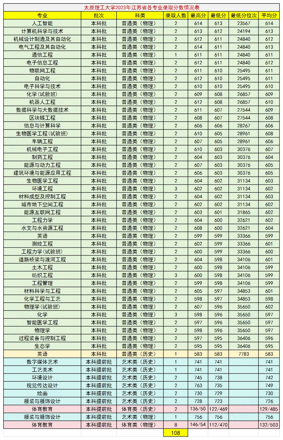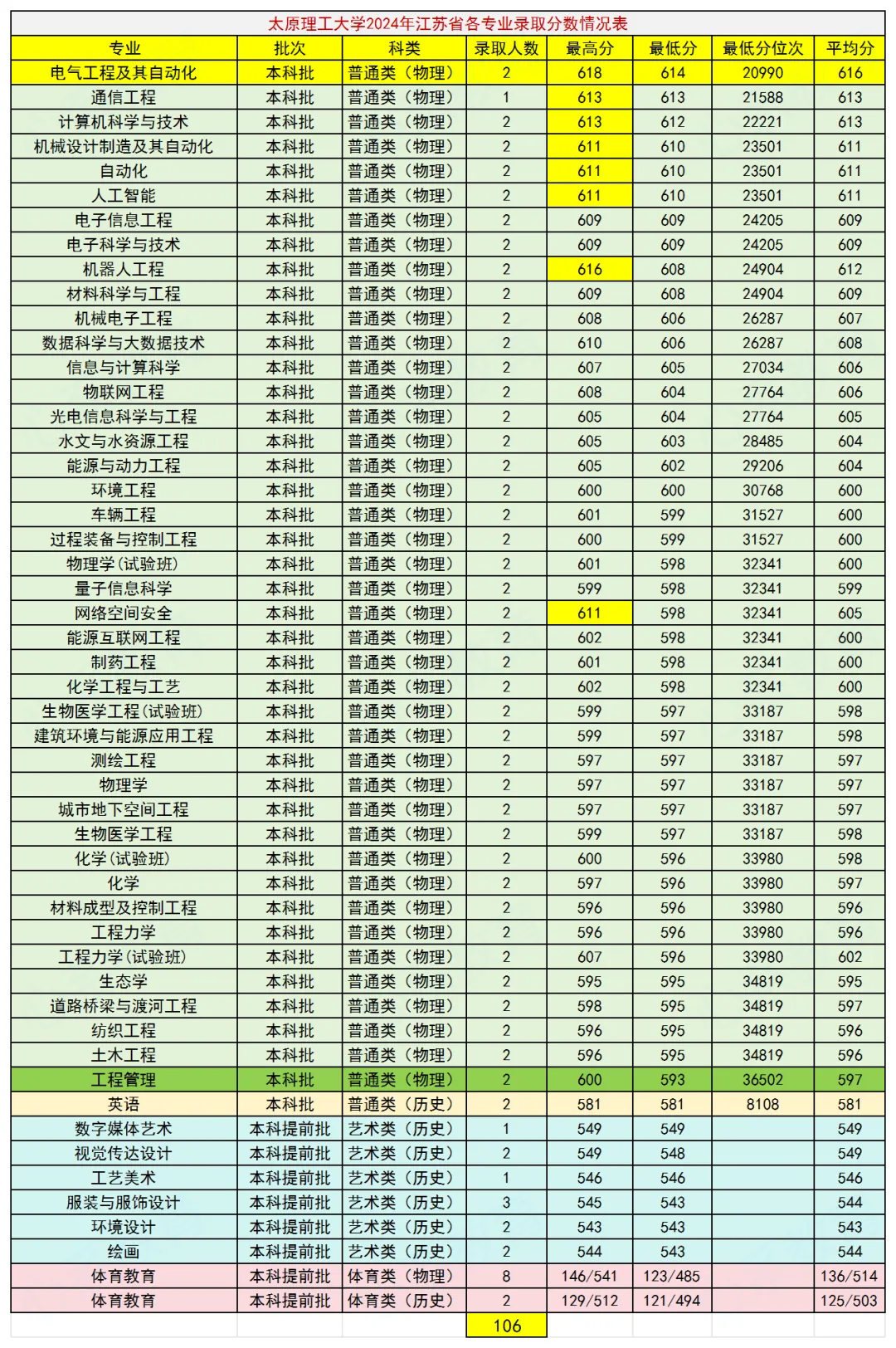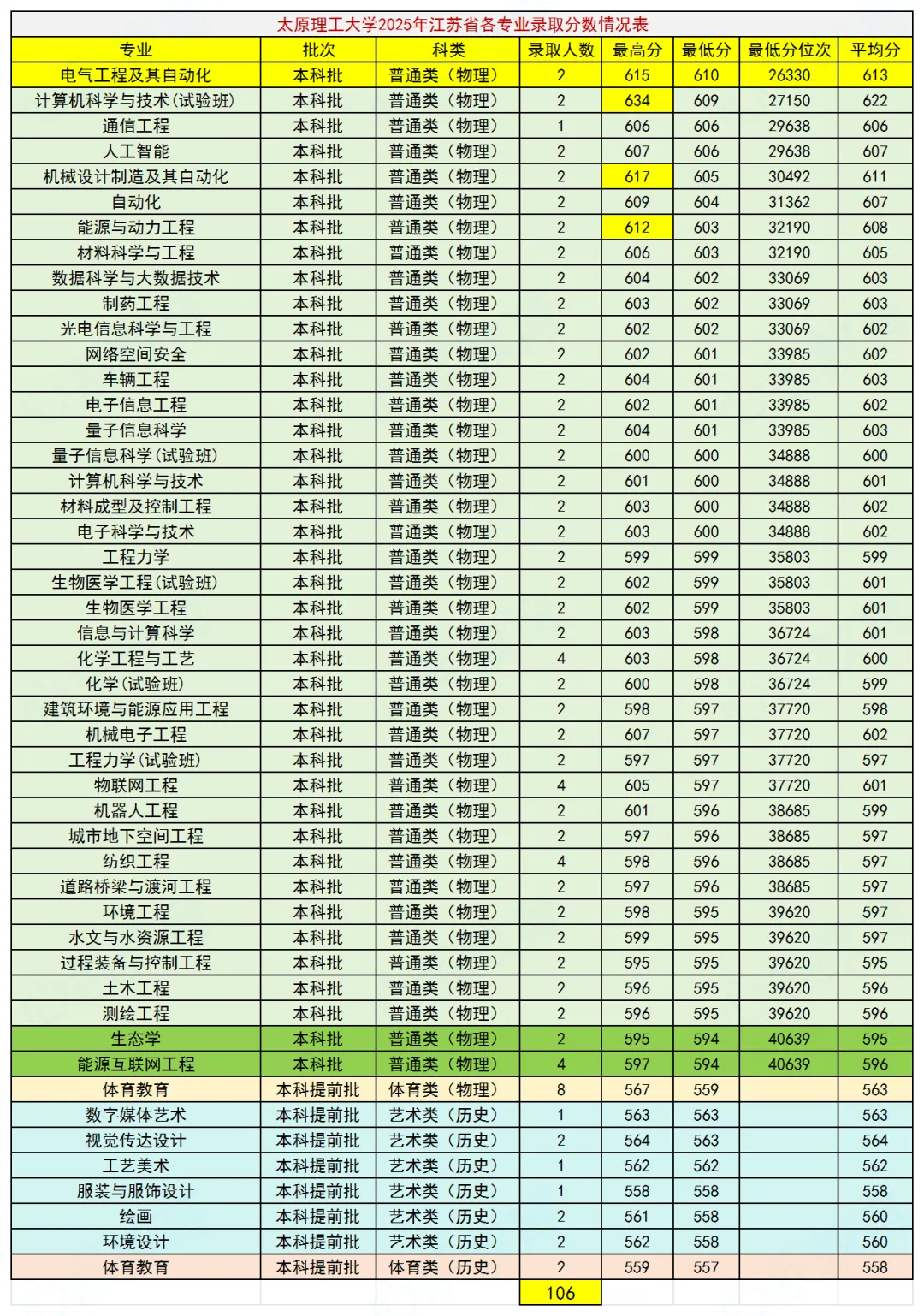 太原理工大学是“211工程”和“双一流”建设高校,位于山西太原,现有明向、迎西、虎峪、柏林等四个校区。学校去年的录取分数线已经公布,这里将其江苏省录取分数线及位次情况整理出来,并将2024年和2023年的录取情况也一并列出,放在一起进行比较,方便大家全面了解学校在江苏省的招生录取情况,为今年的报考提供重要参考,我们一起来看看。各类各专业共录取106人,其中体育类10人,艺术类9人,普通类仅招理科生(物理类)。物理类普通类录取分数线最高的专业是电气工程及其自动化,610分,全省排名26330,最低的是生态学和能源互联网工程,两个专业均为594分,全省排名40639。最高分634分录取在计算机科学与技术(试验班)专业。物理类普通类录取分数线最高的专业也是电气工程及其自动化,614分,全省排名20990,最低的是工程管理专业,593分,全省排名36502。最高分618分录取在电气工程及其自动化专业。历史类普通类仅招英语专业,581分,全省排名8108。物理类普通类录取分数线最高的专业是人,工智能,613分,全省排名23567,最低的是生态学和过程装备与控制工程,两个专业均为595分,全省排名36406。最高分614分录取在人工智能和电气工程及其自动化专业。历史类普通类仅招英语专业,583分,全省排名7783。综合太原理工大学近三年在江苏省的招生录取情况,可以看出:每年招生人数基本上稳定在100到110之间,基本上以物理类考生为主,去年未招历史类考生,另外录取少量的艺体生。录取分数线总体上保持稳定,去年略有下降,需要考到全省四万名左右才有希望被录取。作为外省双一流大学,录取分数线还是比较高的,想考的同学需要好好努力!关于太原理工大学,你有什么看法?欢迎交流!