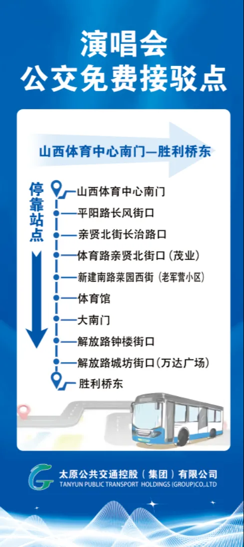胜利桥东接驳专线(15:00-18:30),由胜利桥东公交站始发至山西体育中心南门;