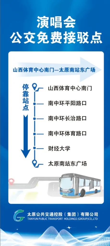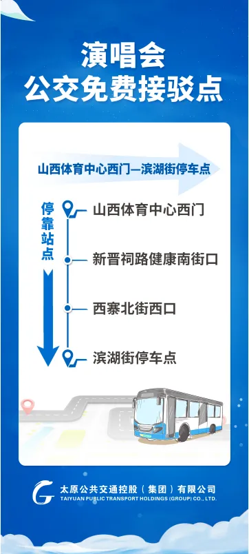 4月11日李荣浩演唱会将在山西体育中心体育场举办,为给广大歌迷特别是外地歌迷提供文明、方便、快捷的乘车环境,太原公交集团公司将在演唱会期间及演唱会前后3天,凭演唱会门票免费乘坐太原所有公交线路(包括所有城际线路及旅游线路),即从4月8日至14日,凭演唱会门票或电子门票,可乘坐太原所有公交线路。演唱会开始前,开通5条由市区、2条由临时停车点至山西体育中心共计7条公交免费接驳专线,以及1条由地铁站直达体育中心南门的公交线路。