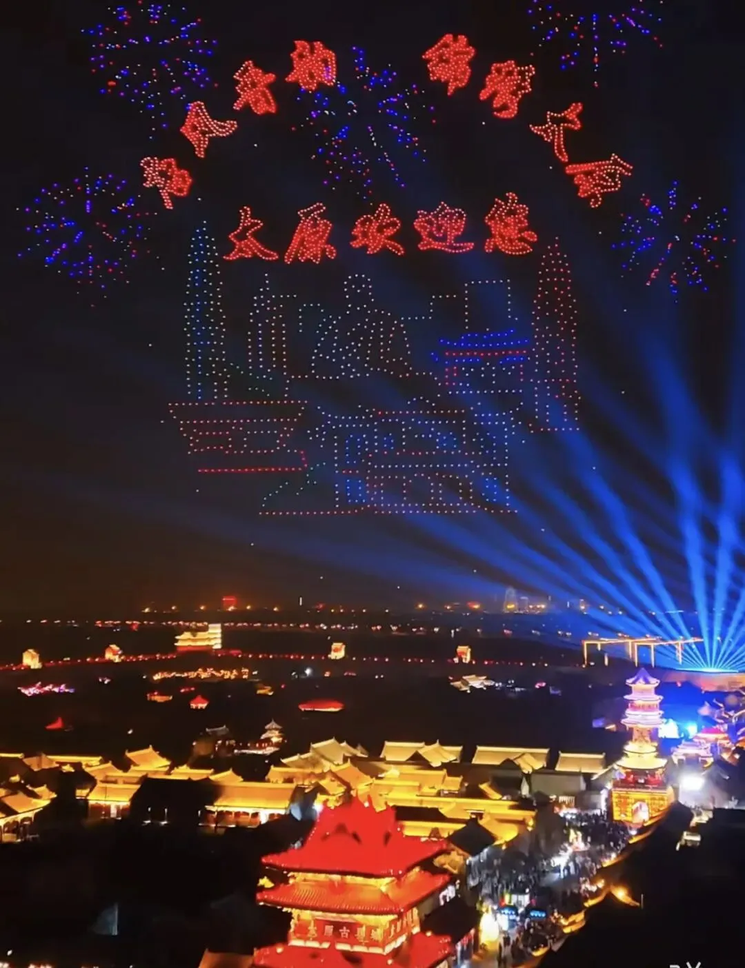 漫步其间,灯火映着人影,古建衬着夜色,无人机光影尚在夜空流转,仿佛一脚踏进旧时年景,又安享当下的宁静祥和。站在灯火深处,看光影流转,听风声低语,恍然不知今夕何夕,只觉此刻安宁,便是岁月最好的馈赠。