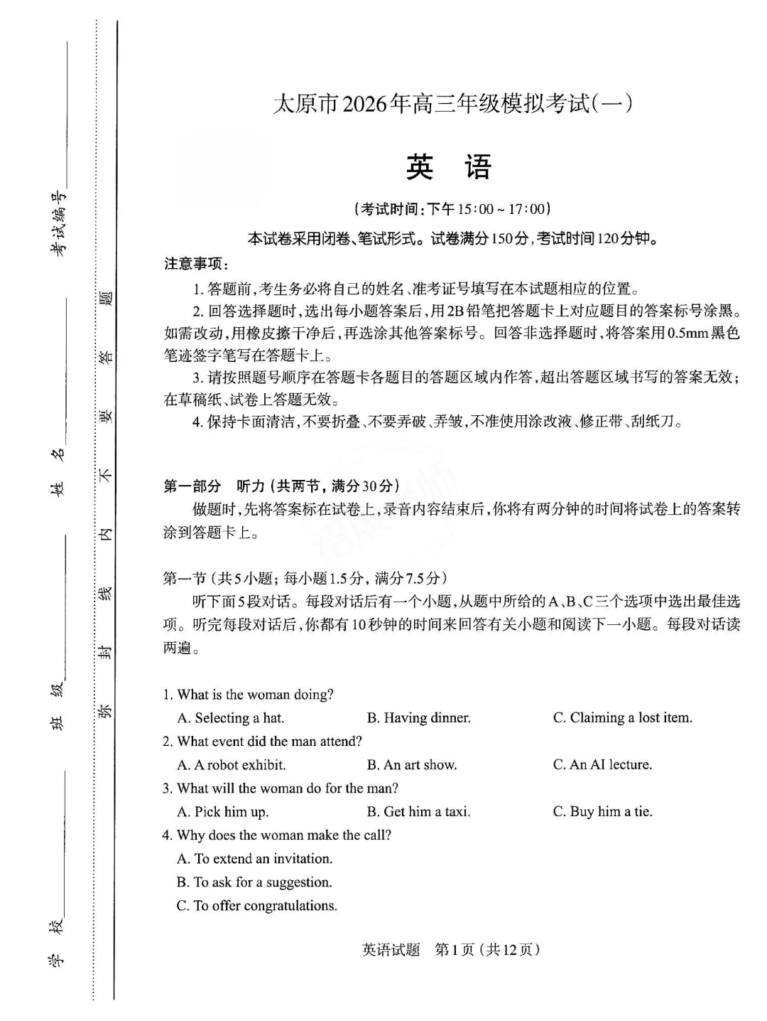 【2026模拟题】429.山西省太原市高三一模英语试题+听力+答案