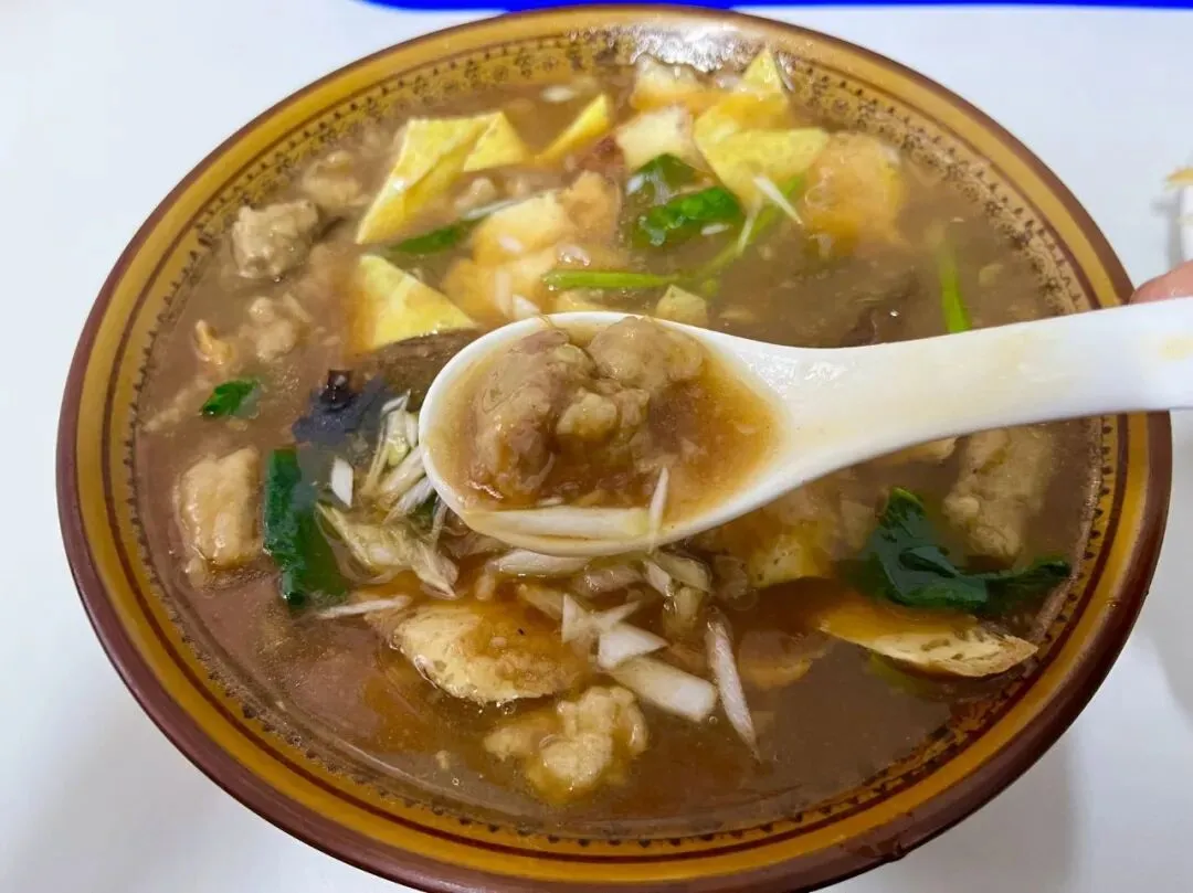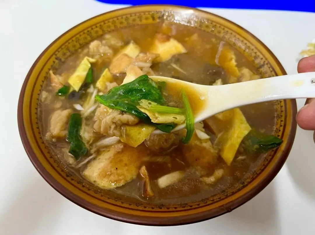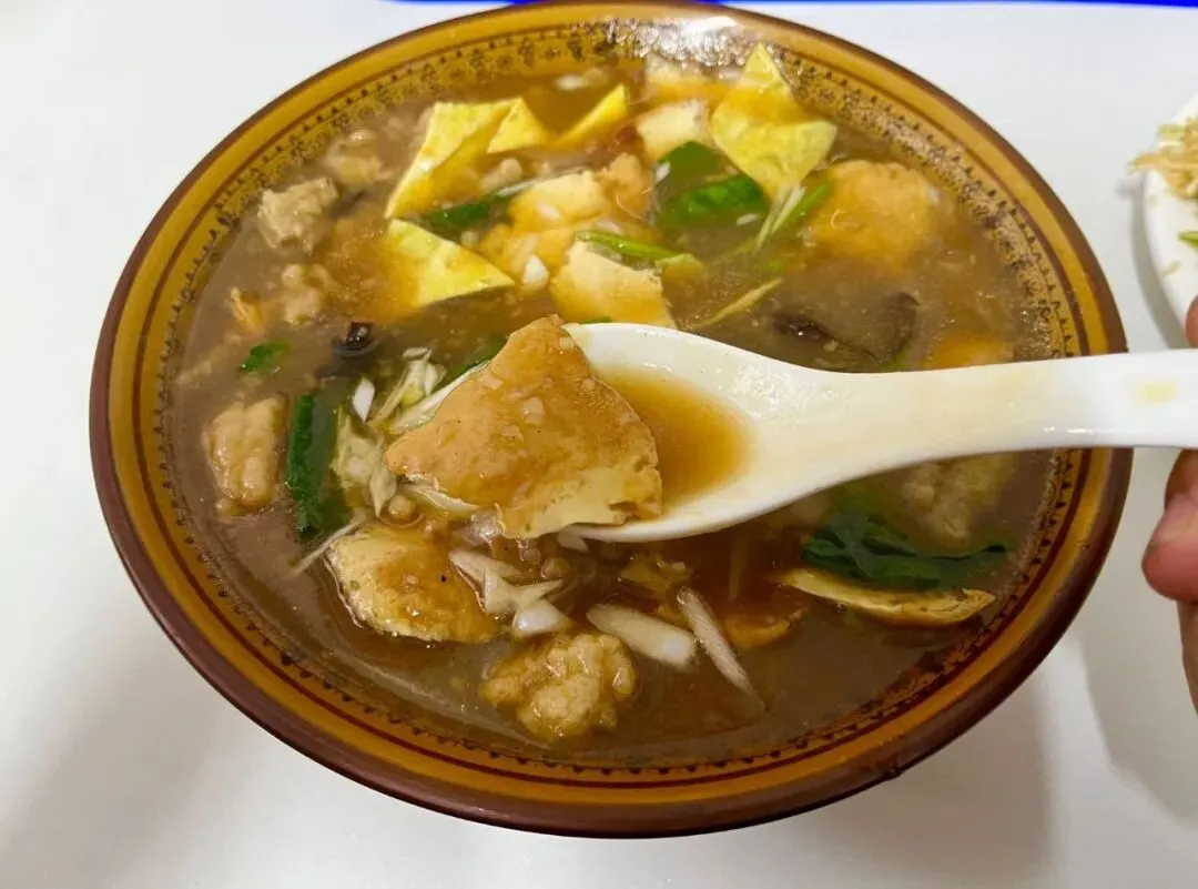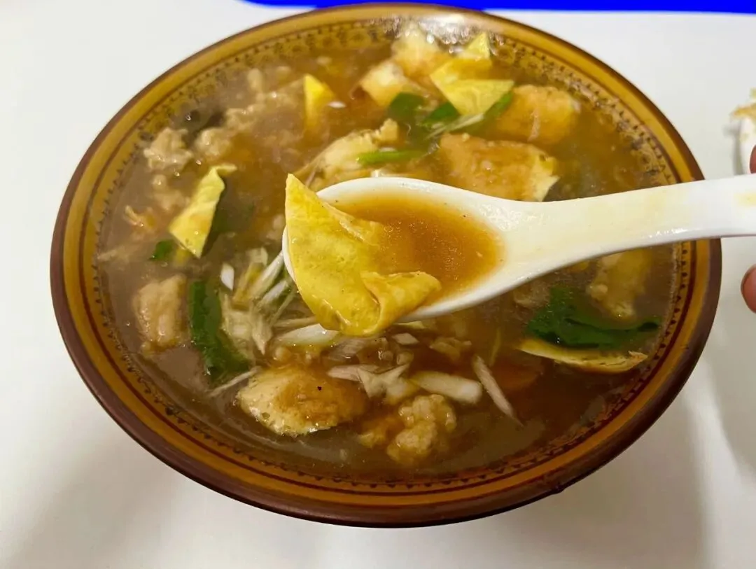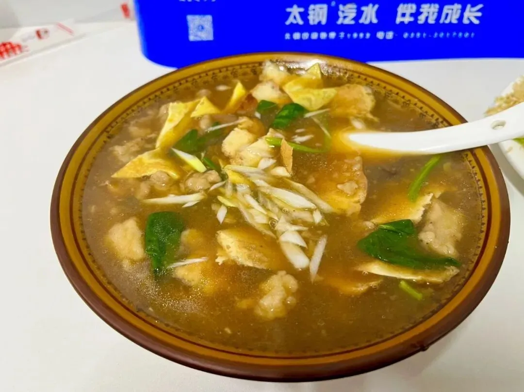 小时候,我家离五阳社区特别近,我们俗称工地,现在好像叫工人村,真的是简单又直白……在我们村与五阳社区的连接处有一处规模很大的早市,那些年襄垣的东湖还是我们村的河湾的时候,我们村也算蔬菜种植大村。我们村的蔬菜一部分是拉到西关菜市场批发出售了,这部分人嫌麻烦卖了回来继续下地干活或者忙其他事去了。另外一部分人就是在早市售卖,平时也有市场可以日常售卖,我们那时候早餐喝豆腐脑比较多,一般配着油条或者麻糖(太原叫糖油饼或甜麻叶)。父亲比较喜欢吃凉皮,告我一块钱既能当饭又能当菜,这家凉皮从去年国庆回去到过年我都没吃上,太让我牵肠挂肚了!那个时候老听母亲她们聊天说看见谁在早市上喝川汤了,她们说的谁,我是一丁点不关心。我是很好奇川汤是个啥?我也问过母亲,母亲大概给我描述了下,当时咋说的,快三十年了,我早忘了。前段时间荆大哥说吃了个我们家乡特产炒炉面和川汤,告我味道很是不错!昨天中午刚好有点事忙的过了饭点了,本来要去吃鸡块面的,突然想起来这家川汤我还一直没喝了!我刚开始就想尝尝川汤得了,配上个烧饼,刚刚好。又想了想这地方说近不近、说远不远,一般情况我真还不太会来这地方吃饭,那就把炒炉面一并安排上吧!我本以为川汤会先上,没想到炒炉面先上了,这打眼一看就和媳妇家做的一样样的,丈母娘手工闹的卤面就这么细,哈哈哈!这两天的天气实在是无语,早上办公室11度,整个人就和在冰窖里待的一样。我算是知道了为啥以前叫打入冷宫了,饱暖思淫欲,待在冷的地方脑子仿佛都被冻住了!啥也不会多想了!关键是我不知道咋想的,还参加了库迪的免单活动,还真给我免单了,我还又喝了一大杯冰美式……喝完之后我整个人感觉不太好,想想还是该喝一杯热茶来着,算了马上到中午了,喝口热汤吧!我吃了一口感觉差我媳妇做的有点远,但是在太原能吃到这口属实是太不容易了!前段时间老大还说我媳妇做的炉面一绝,过年吃年夜饭还想让我媳妇做炉面吃……自从低碳饮食之后我也很久没吃炉面了,以前只要做炉面我晚上都得吃两碗,太香了!早上更不用说,我早上会拿鸡蛋再炒一遍炉面,鸡蛋的香味再加上肉香这种复合香味真的太无敌了!快出锅的时候再淋上一圈锅边醋,出锅,趁热吃,那真的是盖了帽了!黄乐乐早上不爱吃饭都能干一大碗,我早起的时候不多,吃了炉面第二天我一定会早起,就为了这口炒炉面,哈哈哈!自己做主要是配菜足,肉也多,那味道关键是有爱的加持,这是外面不能比的!心心念念的川汤终于上来了!看着不错!这都是老板现做的,不是一锅子闹好持续加热的。这小酥肉真不错,我看墙上还写的“小酥肉核桃肉变种”咸香口,喝了几口身体也变得暖和起来了!舒坦!油炸豆腐片的薄片很入味,14一碗,算得上真材实料。煎鸡蛋闹成薄薄的蛋皮,香啊!肉和蛋的结合总是很奇妙,再加上豆腐,味道真的是棒极了!每次吃饭江浙或者南方的朋友总是说你们不吃菜呀!这次总算是有点绿叶菜了,哈哈哈!喝了一大杯冰美式,好像食欲被抑制了!川汤只舀出来一小碗尝了尝味道,吃完炒炉面就饱了……川汤打包回去给媳妇和黄乐乐尝尝,为下次去晋城做做铺垫。晚上还和彦青兄聊了聊川汤,我看了看这家应该有肠子汤,粉皮鸡丝汤,下次想喝汤了还要多来尝尝。高平十大碗是晋菜系传统宴席,又名长平水席,成型于长平之战后。今年有机会去找彦青兄感受下高平美食,也顺便去看看他那一套从帝都运回来的实木家具。对了,正好我在思考平衡点的时候看见我偶像发了一篇推文,核心就是十二个字“食饮有节,起居有常,不妄作劳”。我豁然开朗,每次偶像总是能给予我莫大的力量,昨晚十一点就躺床上了,今天感觉好多了!