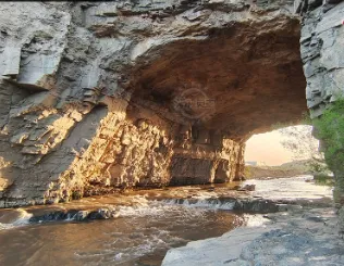 带着一丝小遗憾折返,行至旱道岩隧道附近,眼睛突然亮了:这不就是我之前视频刷到过的“宝藏隧洞”( 旱道岩汾河隧洞)打卡点吗?之前路过一心想着角子崖,竟忽略了这隧洞景观。只见隧洞呈天然拱形,像极了大象鼻子,把奔流而下的汾河河水“吞”进洞里,造就出“水在山中流,山在水上立”的奇景。
