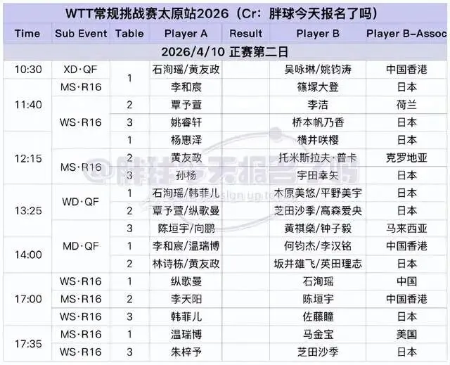 根据赛程安排,4月10日第二个正赛日将进行30场比赛,国乒15名球员要参与15场比赛,除了内战之外,还有9场中日对决,几乎都是国乒小将迎战日本桥本帆乃香、篠塚大登、宇田幸矢、佐藤瞳等名将,林诗栋也将搭档黄友政对战日本男双组合,黄友政单打则是要与欧洲大汉普卡一决高下。
