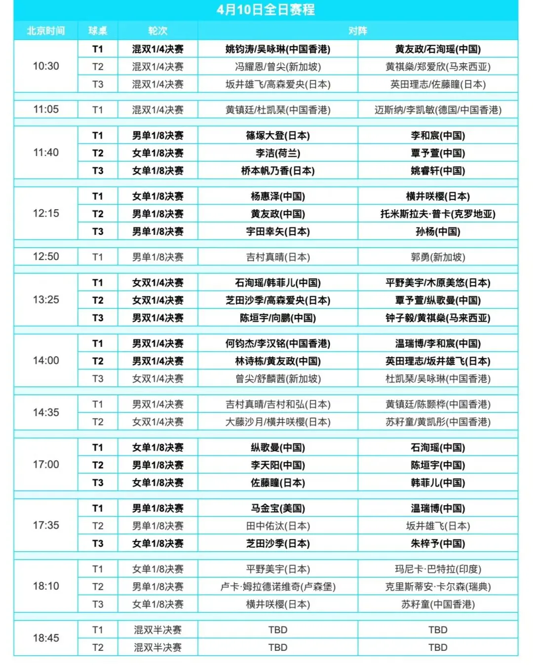 北京时间4月10日,WTT常规挑战赛太原站正赛第二天,今天将进行单打1/8决赛和双打1/4决赛。晚上18:45将进行混双半决赛。昨天1/16决赛,除了男单向鹏出局之外,其他全部晋级1/8决赛。女单除了内战冯怡璇不敌队友出局之外,其他的女单也全部晋级1/8决赛。男双3对晋级1/4决赛,女双两对晋级1/4决赛,混双仅 石洵瑶/黄友政组合晋级1/4决赛。
