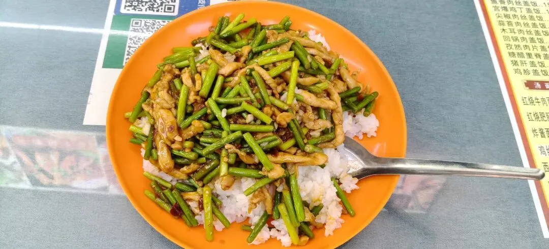 时间不早,我们在广场附近的一家餐馆吃了晚餐。我点的是蒜苗炒肉丝盖浇饭,永高兄点的是鱼肉丝盖浇饭,15元一份,价格合理,口味也行。去年去了十几个城市,比较而言,太原的餐饮价格还算亲民。