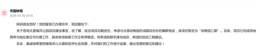 最近有市民在地方领导留言板咨询项目进度,太原市园林局给出了最终官方回复: