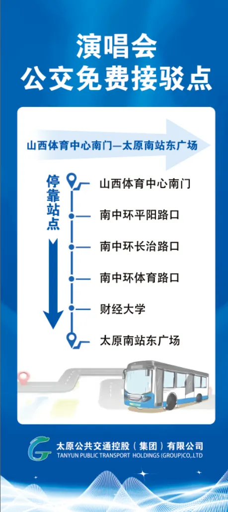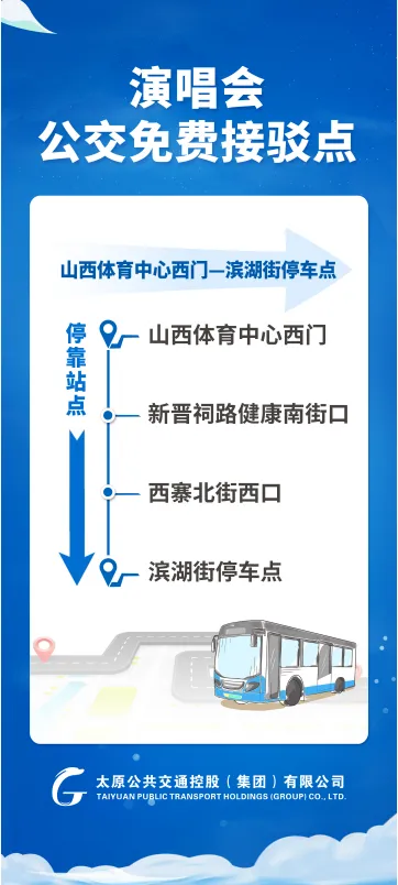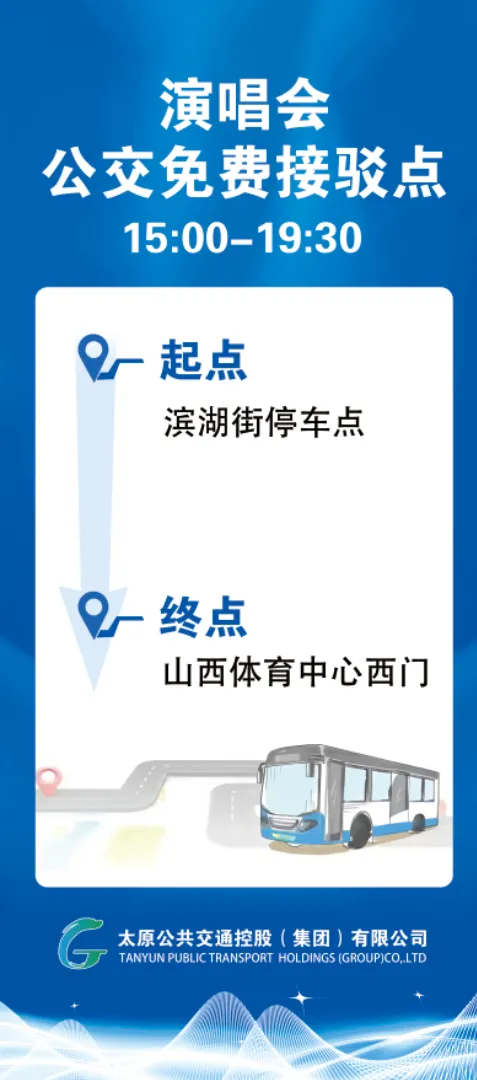 演唱会开始前,开通5条由市区、2条由临时停车点至山西体育中心共计7条公交免费接驳专线,以及1条由地铁站直达体育中心南门的公交线路。