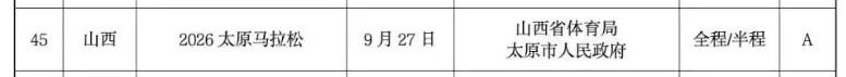据世界田联2026年官方赛事日历显示,9月金标马拉松赛事--2026太原马拉松赛事将于2026年9月27日(周日)开跑,赛事设马拉、半程马拉松两个项目,赛事规模为35000人,报名即将启动。