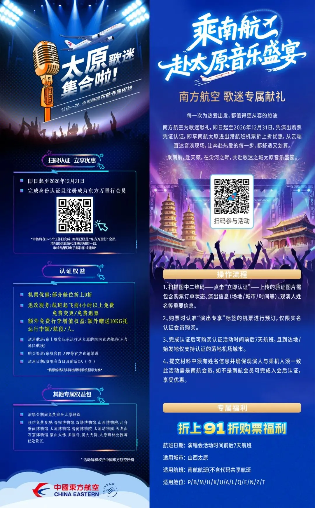 为降低外地歌迷抵并成本,提升出行体验,太原联合中国南方航空、中国东方航空重磅推出歌迷专享航空福利。凡持有2026年太原演唱会门票的歌迷,购票时完成身份核验后,即可享受指定航班机票折上折优惠,真正实现“省钱赴约,轻松出行”。