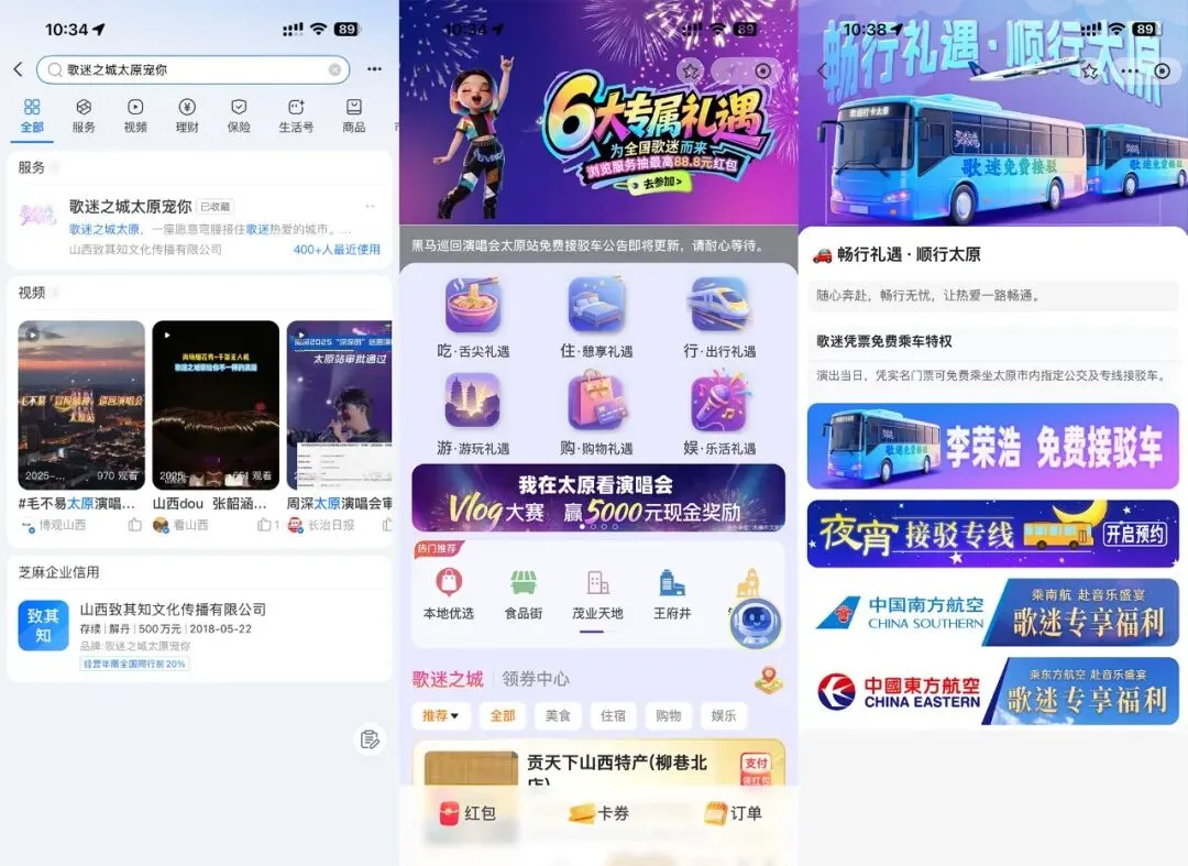 所有夜宵专线预约、航司福利查询,均可通过统一入口操作:支付宝搜索【歌迷之城太原宠你】→ 进入【行・出行礼遇】板块