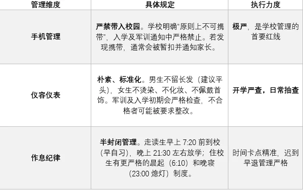 宿舍管理:实行宿管制,按时熄灯、内务检查严格。对于违规(如夜不归宿、爬墙外出)会严肃处理,甚至取消住宿资格