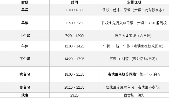 以下为学校通用的作息框架,实际执行中高一高二与高三、不同班主任要求会有微调。