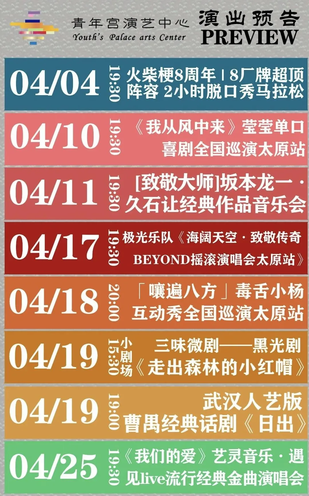 参差读书沙龙第190期:聊聊你读过的心理学书籍 时间:4月12日(周日)15:00 地点:寻画廊 龙城艺术电影沙龙:《福尔摩斯二世》《山海经》 时间:4月11日(周六)9:00 地点:山西剧院 晋界讲坛:流布遍及北中国的介休窑细白磁——以北宋为中心、永定河畔的千年窑火——北京龙泉务窑 时间:4月11-12日9:30 地点:山西博物院 太图讲坛:非物质文化遗产视野下的传统壁画保护和修复 时间:4月11日9:30 地点:太原市图书馆 李荣浩“黑马”世界巡回演唱会 时间:4月11日19:30 地点:山西体育中心体育场 山西大剧院四月演出8场 时间:4月11-30日19:30 地点:山西大剧院 青年宫四月演出8场 时间:4月11-30日19:30 地点:青年宫演艺中心 南宫四月演出5场 时间:4月11-30日19:30 地点:太原工人文化宫 海妖新喜剧:脱口秀&喜剧演出 时间:4月11-30日19:30 地点:海妖百花谷剧场 火柴梗脱口秀&喜剧演出 时间:4月11-30日19:30 地点:火柴梗华宇喜剧中心 思无邪讲坛第57期:群星璀璨——唐诗宋词里的山西籍诗人 时间:4月12日9:30 地点:寻画廊 Boo四月活动12场 时间:4月12-30日 地点:TheBoo ModerSky四月活动12场 时间:4月12-30日 地点:ModerSky LAB “一切皆为关系性”罗衣个展、“答案的问题”沈采个展、“方寸·间”李少伟个展 时间:4月4日-6月3日 地点:长江美术馆 “再存为:算法雕塑”缪晓春个展、“无始无终”特别展览 时间:4月2日-5月10日 地点:山西省当代美术馆 “大师镜语”弗兰克·霍瓦特个人回顾展 时间:3月29日-6月29日 地点:山姆美术馆 “星空下的蜗牛”公益画展 时间:3月28日-6月1日 地点:陌上文化艺术空间 “无人区”山西在地艺术家展 时间:3月27日-6月7日 地点:在美术馆 “守望”明太原县城城墙遗址展、“方圆并现”宋朝铜钱文化展 时间:2月27日-4月30日 地点:晋阳古城考古博物馆 “北白”白瓷与民族融合特展、“融·变”南涅水石刻艺术展、“相马”马文物特展 时间:2月10日-5月5日 地点:山西博物院 “夏时期的中国”文物展、“马舞新春”马年生肖文化大联展、“光影有戏”馆藏清代皮影精品展 时间:2月10日-5月10日 地点:山西青铜博物馆 |