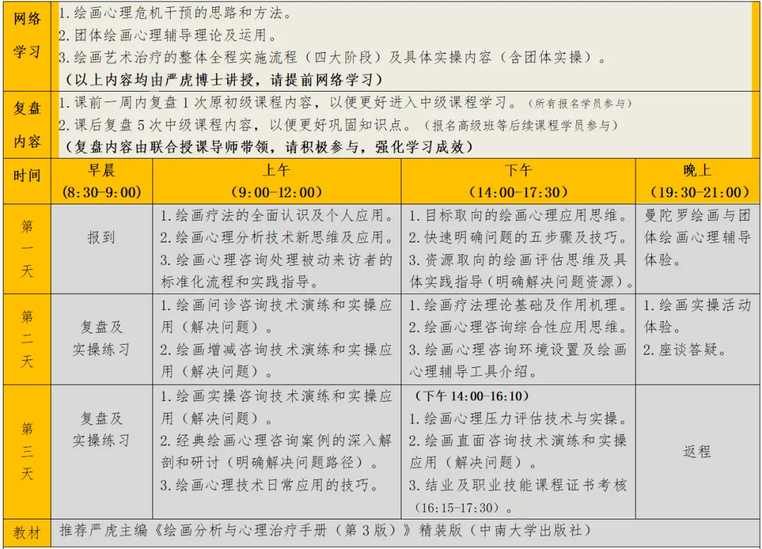 本课程侧重于绘画心理学实践应用和咨询实操。突破常规绘画心理分析与咨询过分依赖来访者领悟和转归思路,直击具体问题的解决方案,强调标准化操作流程,即绘画心理咨询技术对于具体问题咨询的流程,同时强化绘画心理学的实践应用思维,以目标为中心,突出实际问题的解决方案。与此同时,辅以如叛逆被动来访者的打破防御技术、团体绘画心理辅导、曼陀罗绘画技术等。课程也强调理论与实践结合,实操与督导结合,学习与个人成长结合,地面与网络结合等先进理论思想。