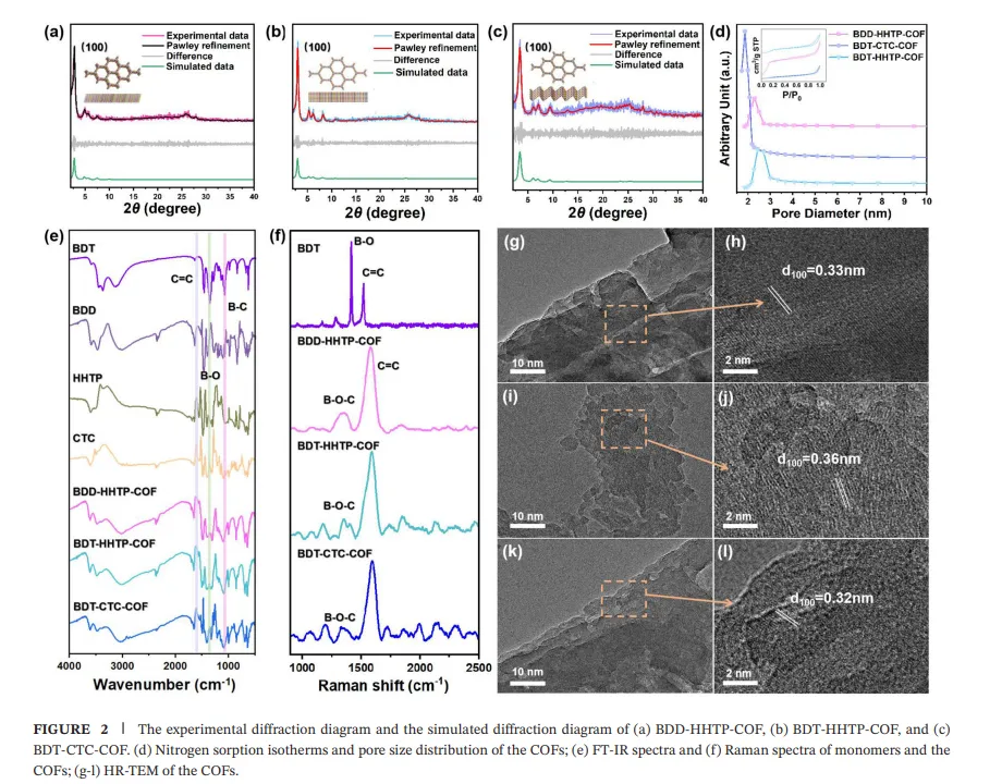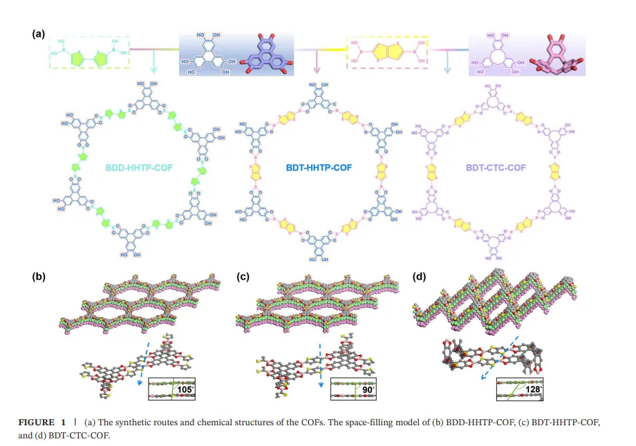 作者采用脱水缩合反应,将不同的折叠构建基元整合到材料骨架中,成功构筑了三种基于噻吩衍生物的二维共价有机框架材料,分别为BDT-HHTP-COF、BDD-HHTP-COF和BDT-CTC-COF。与依赖传统面对面刚性堆叠的体系相比,该合成策略的新颖之处在于通过单体构型设计,分别实现了90度、105度和128度的层间错位堆叠角度。这种精准的几何调节从底层结构上改变了层间相互作用,为后续光生激子动力学的调控奠定了坚实的结构基础。