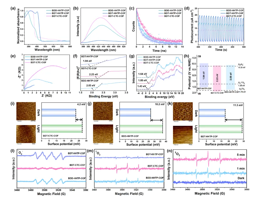 傅里叶变换红外光谱和拉曼光谱中特有的硼氧键和硼碳键振动信号,证实了硼酸酯连接键的成功形成以及三种共价有机框架的成功构筑。高分辨透射电子显微镜结果提供了不同堆叠模式的最直观证据,观察到三种材料分别具有3.20埃、3.30埃和3.60埃的晶格间距。最关键的光电表征结果显示,具有面对面堆叠结构的BDT-HHTP-COF展现出11.5 mV的最大表面电势差和最强的瞬态光电流密度,证明其具有极强的光生电子空穴分离能力。相反,错位堆叠最显著的BDT-CTC-COF的表面电势差仅为4.2 mV,这证明较小的内建电场抑制了激子向电子空穴对的解离,从而更加有利于激子整体的转移。