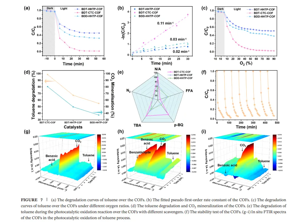 在以甲苯选择性氧化为模型反应的光催化测试中,具有128度错位堆叠的BDT-CTC-COF展现出最为优异的性能,在30分钟内对甲苯的降解效率达到了98.68%。其光降解速率常数高达0.11 min-1,分别是对比体系BDD-HHTP-COF和BDT-HHTP-COF的3.8倍和5倍。此外,BDT-CTC-COF实现了超过80%的二氧化碳矿化率,这一数值是电子转移主导体系的1.5倍。在经历连续十次循环测试后,该材料对甲苯的降解率依然稳定保持在95%以上,展现出了极其优异的循环稳定性和实际应用潜力。