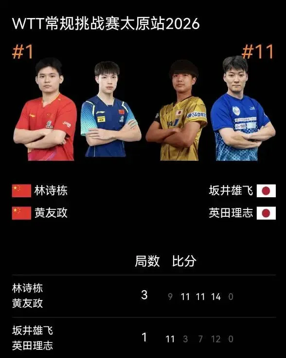 4月10日下午,WTT常规挑战赛太原站男双半决赛,海南籍国乒选手林诗栋搭档黄友政以3:1(9:11、11:3、11:7、14:12)战胜了日本组合坂井雄飞/英田理志,晋级男双半决赛。
