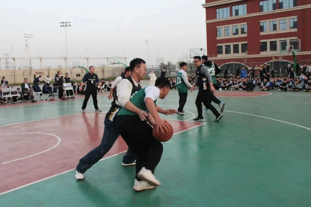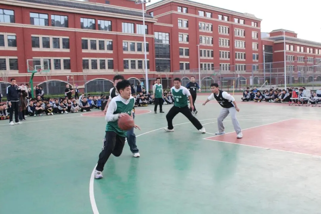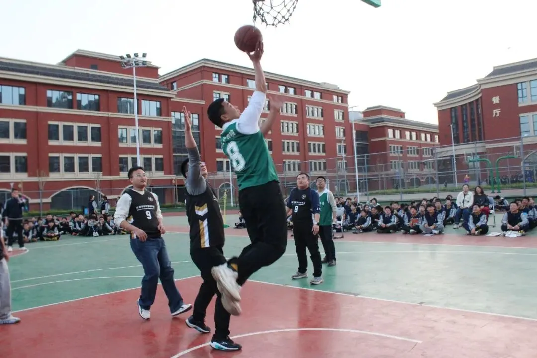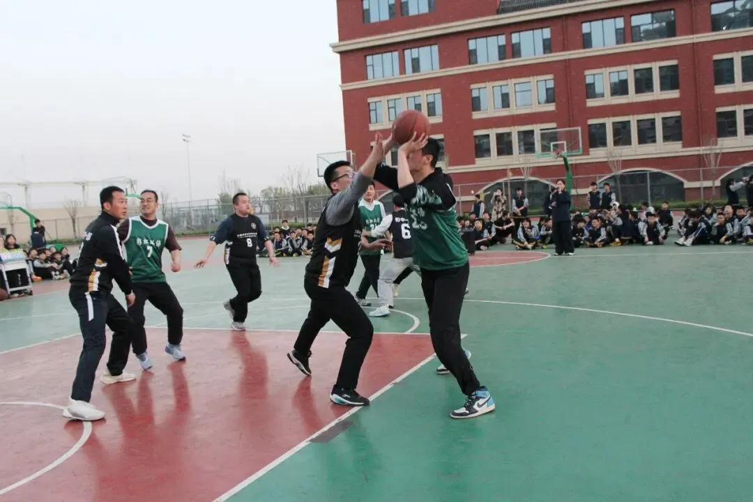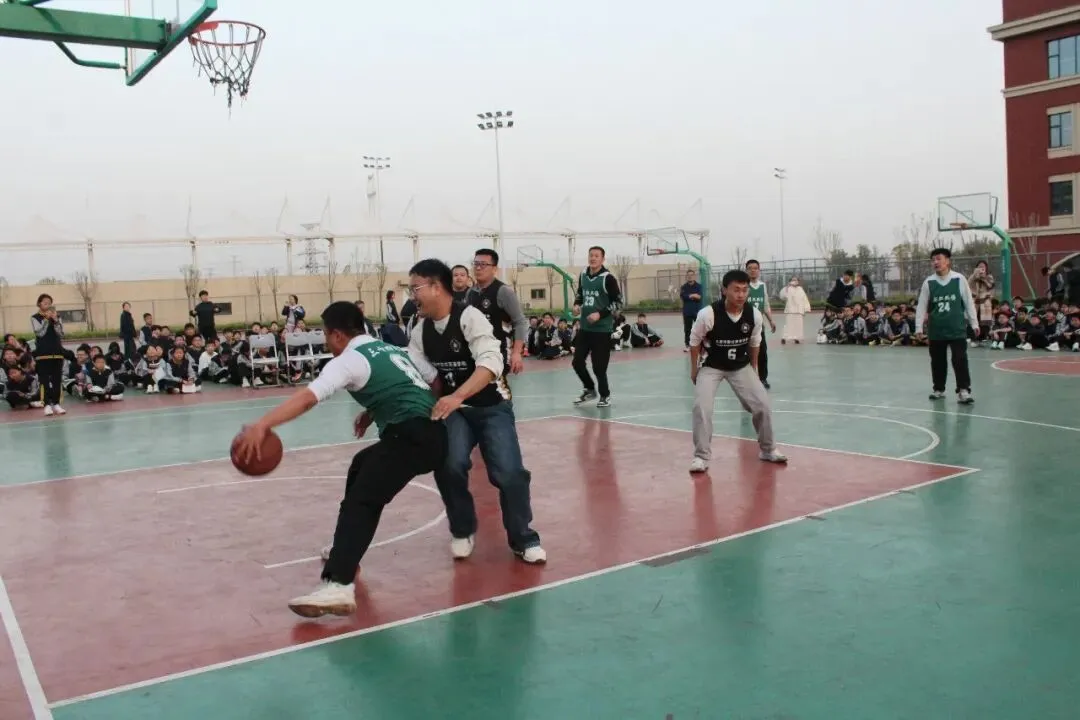 老教师沉稳老练,凭借丰富的经验卡位抢板、精准传球,用从容与果敢展现着师者的担当;青年教师活力四射,凭借敏捷的步伐突破防线、奋勇上篮,用激情与朝气诠释着青春的力量,恰如学校“老中青教师各展所长、协同成长”的师资建设理念。队员们有的巧妙虚晃、突破夹击,有的精准抢断、快速反击,有的纵身跃起、奋力封盖,每一次精彩表现都引来场边师生的阵阵欢呼与掌声。