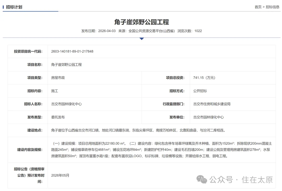 面对游客们日益高涨的探索热情,以及为提升景区接待能力、保障游客安全与体验,古交市园林绿化中心于2026年4月3日正式发布了“角子崖郊野公园工程”的招标计划。这一举措标志着角子崖将从一处纯天然的徒步景点,向设施更完善、管理更规范的郊野公园转型升级。