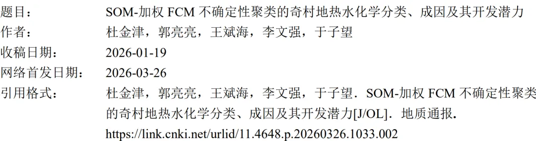 为探明奇村地热区地热流体化学特征、控制因素、成因机制及开发利用潜力,本研究通过Piper三线图、Gibbs图和离子端元图分析研究区地热水化学特征,采用熵权水质指数法对水质进行评价。引入自组织映射网络(SOM)与加权FCM模糊聚类相结合的方法识别水化学类型,通过Bootstrap重采样对聚类稳定性进行检验,揭示地热水主要物质来源、水质影响因素与地热流体成因机制,分析开发潜力。