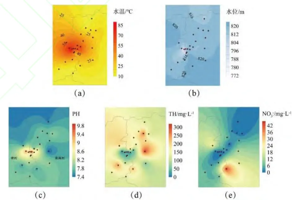 ▲ (a)水温分布;(b)水位分布;(c)pH分布;(d)总硬度TH分布;(e)NO₃⁻浓度分布