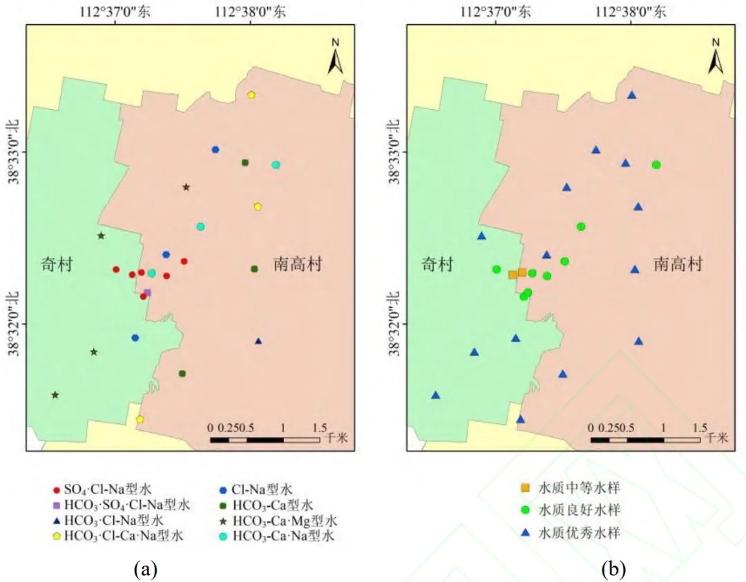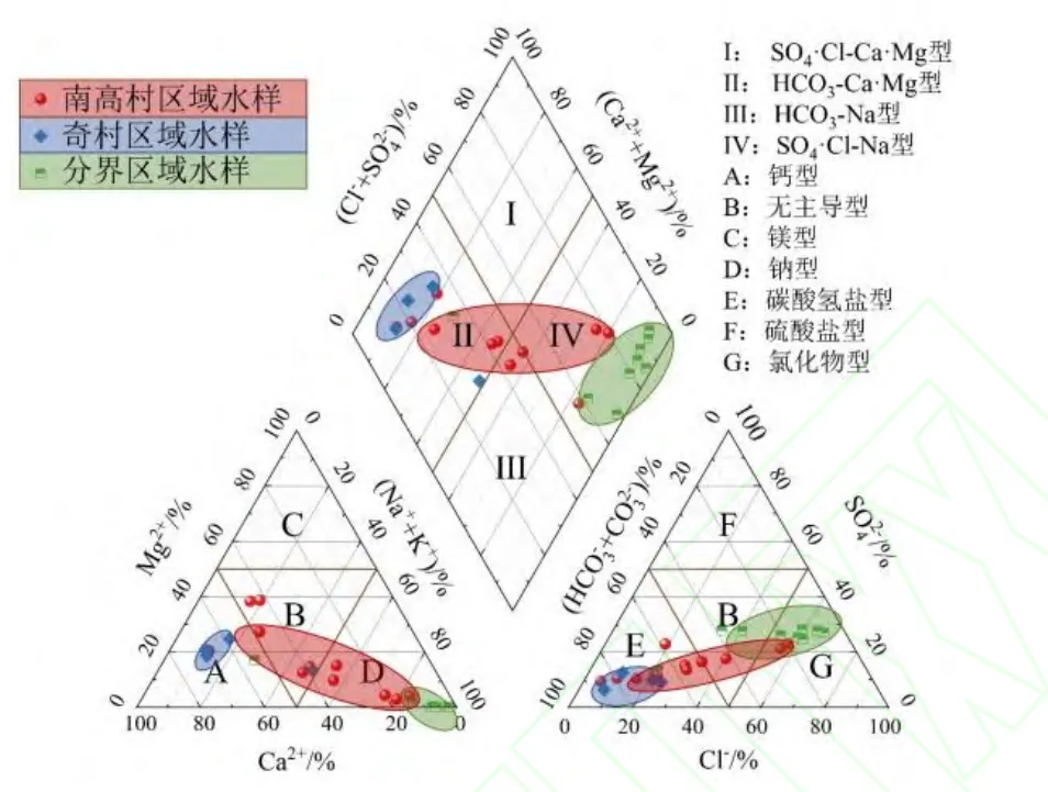 ▲ 地下水优势阴阳离子分别为HCO₃⁻、Cl⁻和Na⁺,南高村与奇村区域水化学类型具有区域性差异