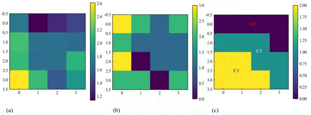 ▲ (a)SOM相邻节点距离分布;(b)SOM节点命中数分布;(c)SOM-加权FCM聚类分区