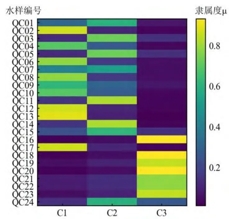 ▲ 不同水样对类别的隶属度差异明显,少数水样隶属度分散,分类不确定性较高