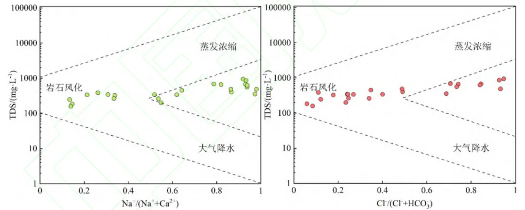 ▲ 水样点集中在岩石风化控制区,岩石风化作用对水化学组分影响较大