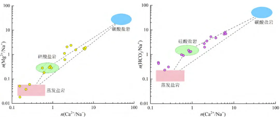 Gibbs图显示水样点集中在岩石风化控制区,蒸发浓缩与大气降水作用较弱。离子端元图(n(Ca²⁺/Na⁺) vs n(Mg²⁺/Na⁺)、n(HCO₃⁻/Na⁺))表明,多数水样点分布在硅酸盐岩影响区域附近,少量位于蒸发盐岩区域,说明硅酸盐岩风化溶解是地热水离子的主要来源,同时叠加局部蒸发盐岩贡献。