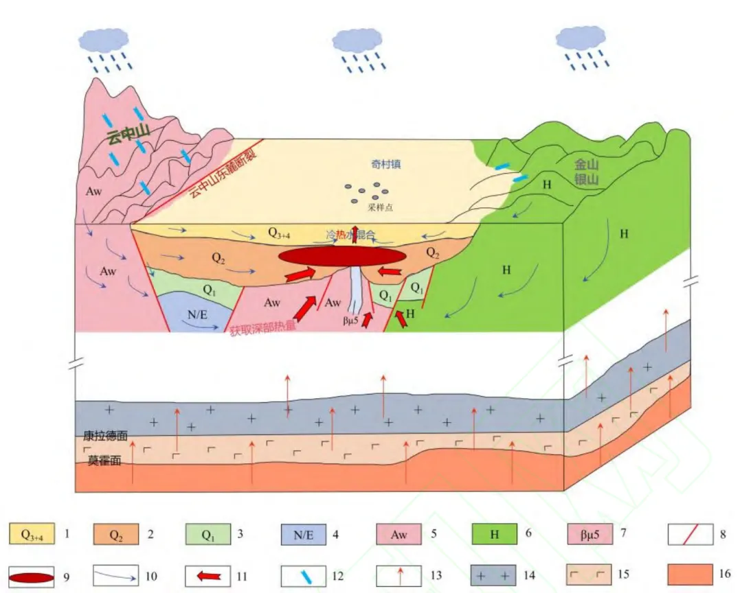 ▲ 大气降水通过断裂垂直入渗,经深部加热后沿次级断裂上涌,与浅层冷水混合形成热储