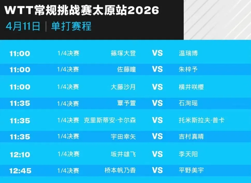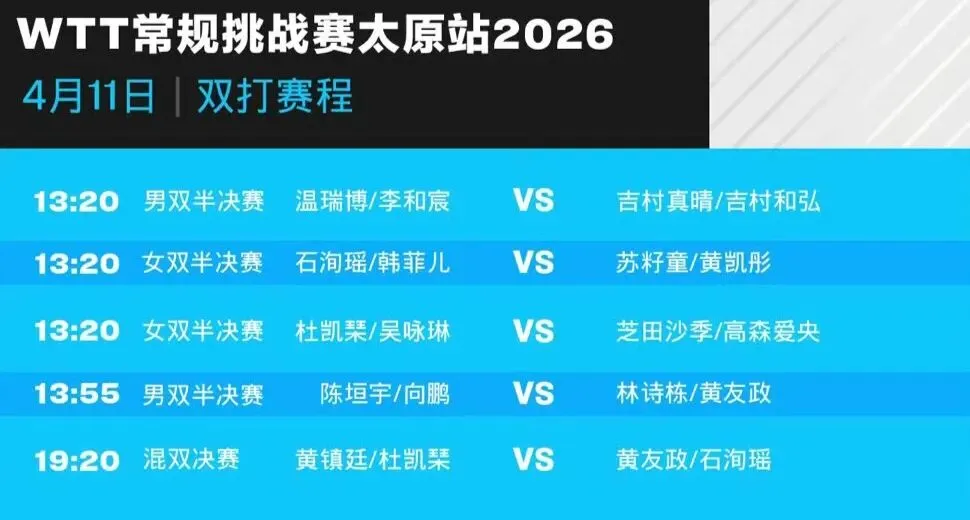 北京时间4月11日,WTT常规挑战赛太原站单打1/8决赛已经全部结束了,国乒男单温瑞博、李天阳晋级1/4决赛。女单覃予萱、石洵瑶和朱梓予晋级1/4决赛。男双林诗栋/黄友政、陈垣宇/向鹏和温瑞博/李和宸组合晋级半决赛。女双只有石洵瑶/韩菲儿晋级半决赛。混双也只有黄友政/石洵瑶晋级半决赛,并且半决赛昨天已经3-1战胜了日本组合坂井雄飞/高森爱央,今天晚上19:20决赛对阵中国香港组合黄镇廷/杜凯琹 。