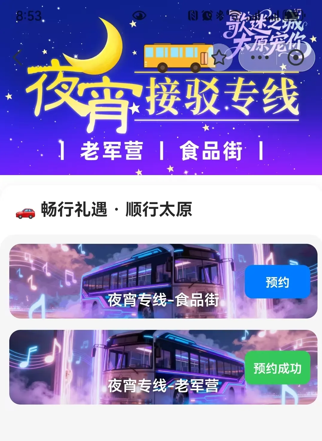 为了让歌迷看完演唱会就能直达夜宵商圈,沉浸式感受太原夜间烟火气。太原新增两条免费夜宵接驳专线。散场后,歌迷无需为打车排队、交通拥堵发愁,可直接乘坐专线前往热门夜宵点位。预约方式简便快捷:歌迷只需打开支付宝,搜索“歌迷之城太原宠你”,进入小程序后点击“行·出行礼遇”板块,选择“夜宵接驳专线”,即可一键预约对应线路,凭演唱会电子票夹免费乘坐。