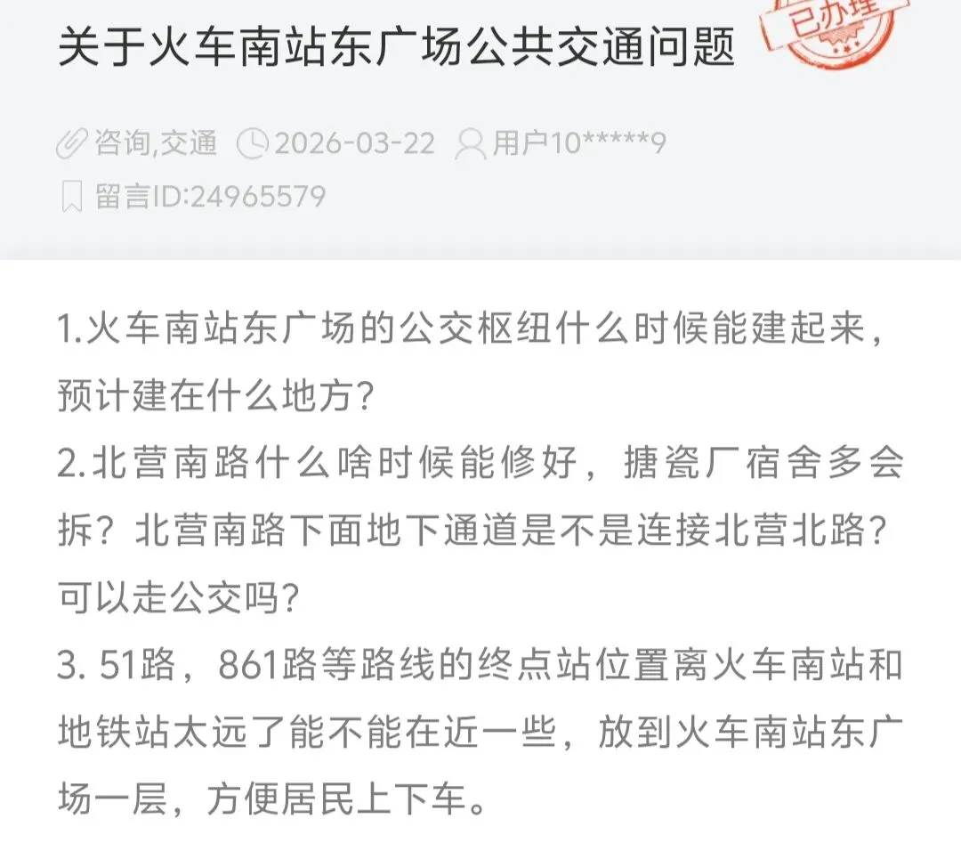 近日,有热心网友通过人民网“领导留言板”反映太原火车南站东广场公共交通相关问题,涉及公交枢纽建设、北营南路修路及塘瓷厂宿舍拆迁、部分公交线路站点设置等。对此,太原公共交通控股(集团)有限公司、小店区政府、太原市住房和城乡建设局联合作出官方回复。