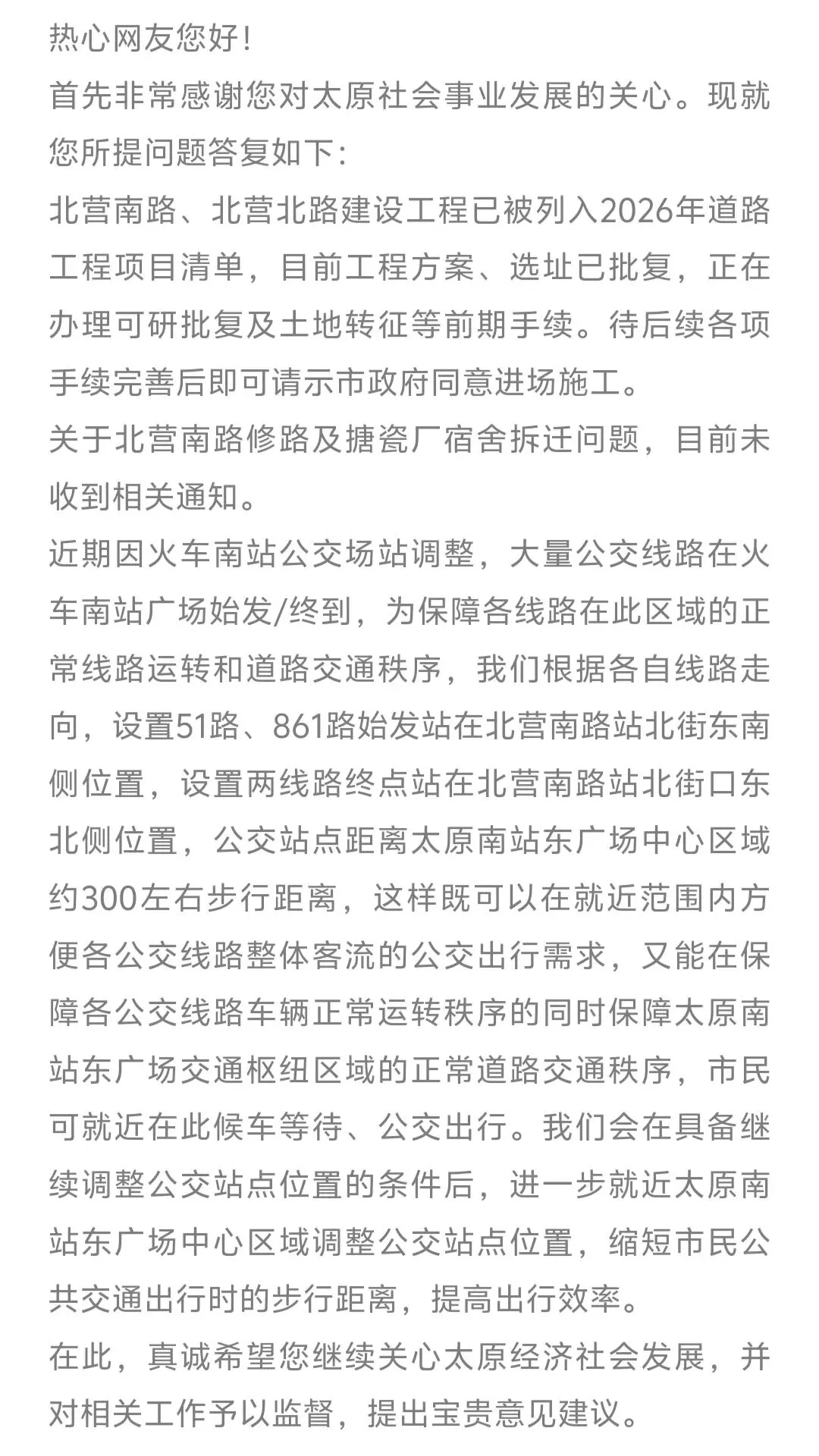 相关部门在回复最后表示,真诚希望网友继续关心太原经济社会发展,对相关工作予以监督,提出宝贵意见建议。太原南站作为城市重要交通枢纽,公交配套的完善直接关系广大市民和旅客的出行体验。虽然目前部分公交站点距离广场中心还有一定距离,但300米的步行距离在可接受范围内。期待随着道路工程的推进和公交场站的进一步优化,太原南站东广场的公共交通服务能够更加便捷高效。