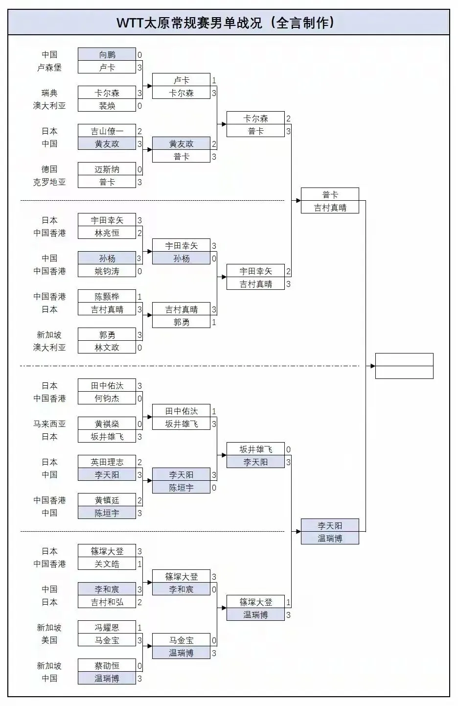 北京时间4月11日下午,WTT太原常规赛男单1/4决赛全部结束。