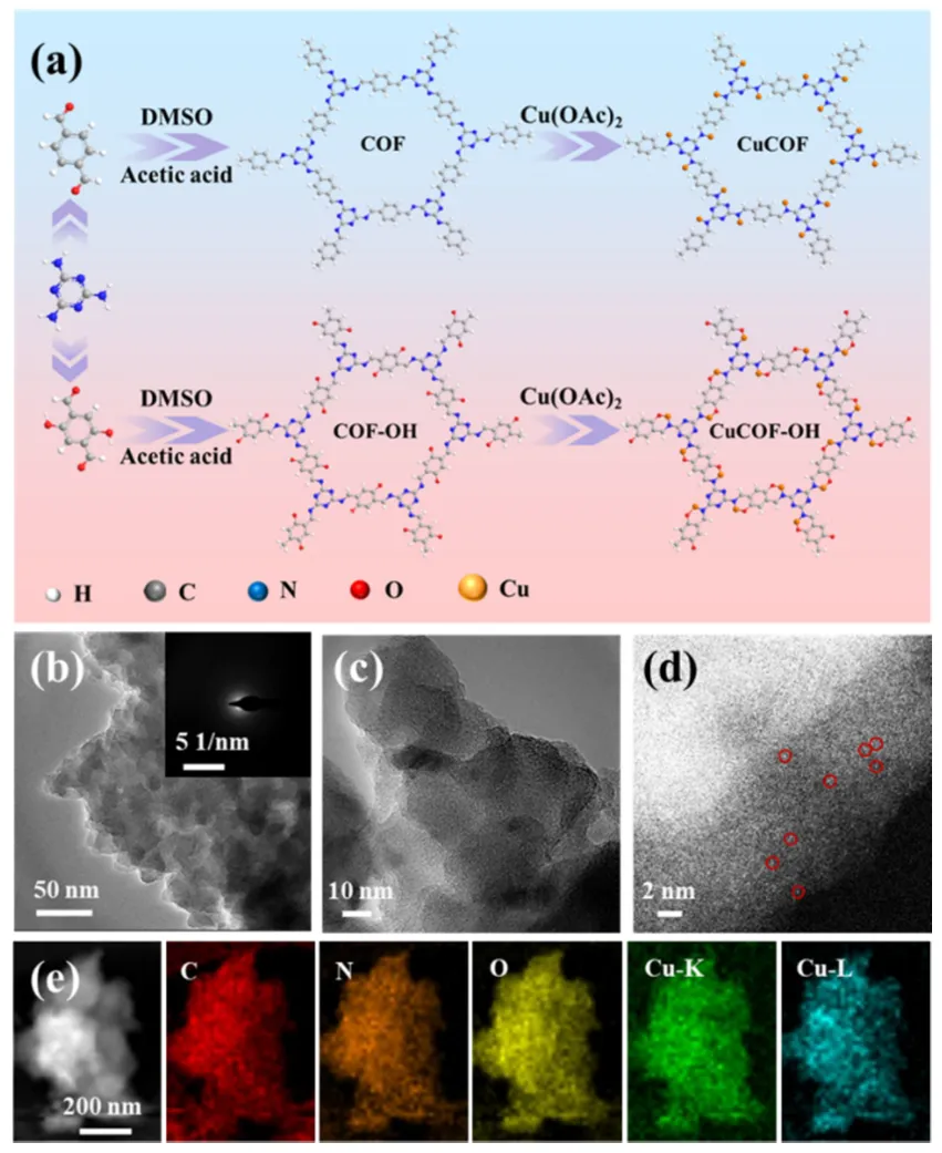 1. 图1a展示了CuCOF和CuCOF-OH的合成路线:通过三聚氰胺与2,5-二羟基对苯二甲醛的酸催化缩聚反应形成COF-OH,随后在甲醇中与醋酸铜搅拌进行后合成金属化引入Cu位点