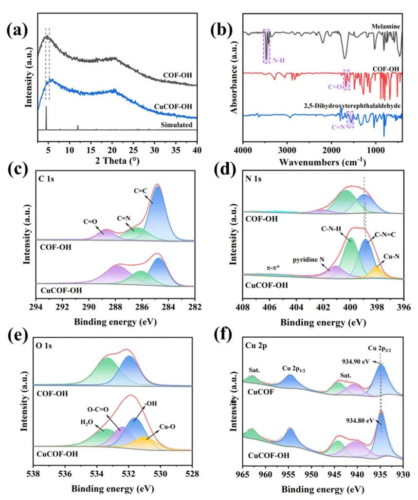 3. 图2d的N 1s XPS谱图显示CuCOF-OH在397.88 eV出现Cu-N配位峰,证实亚胺氮与Cu²⁺成功配位